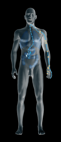 The Primary Lung Channel is called hand Greater Yin. It originates from the Middle Burner (Stomach) and passes downward to connect with the Large Intestine. Returning upward again, it goes along the upper orifice of the Stomach, crosses the diaphragm and enters it's associated Organ, the Lungs. Emerging at Lu-1 (Zhongfu) on the area between the Lung and shoulder, the Channel descends along the anterior side of the upper arm (on the lateral border of the Biceps Brachii Muscle), lateral to the Heart and pericardium Channels. Reaching the elbow, it continues along the anterior radial aspect of the arm and reaches the styloid process of the radius. It then goes to the thenar eminence and ends at the medial side of the tip of the thumb (Shaoshang, Lu-11).