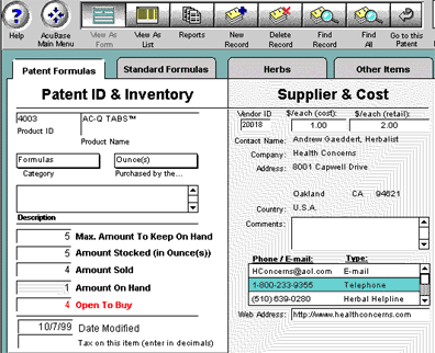 Form View's Patent Formulas, Standard Formulas, or Herbs tab, you may