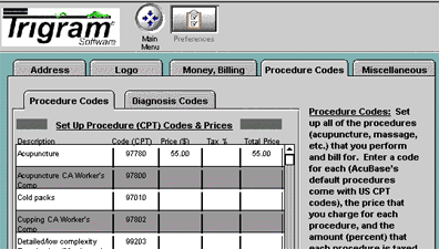 codes, prices, and tax rates for each. Set up diagnosis descriptions