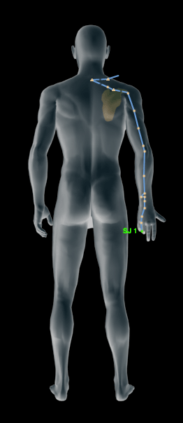 The Primary Triple Burner Channel of hand Lesser Yang originates on the ulnar side on the tip of the ring finger, ascends between the fourth and fifth metacarpal bones on the dorsum of the hand and through the wrist, traverses the forearm between the ulna and radius, and continues upward across the olecranon and the lateral side of the upper arm to the shoulder. Here it intersects the Small Intestine Channel at SI-12 (Bingfeng) and meets the Governing (Du) Channel at Du-14 (Dazhui) before crossing back over the shoulder. It then intersects the Gall Bladder at Gb-21 (Jianjing), from which it enters the supraclavicular fossa and goes to the mid-chest region at Ren-17 (Shanzhong). From here, it connects with the Pericardium and descends across the diaphragm to the abdomen linking with the Upper, Middle, and Lower Burners, to which this Channel belongs. A branch separates from the main pathway in the chest at Ren-17 (Shanzhong) and ascends to emerge superficially from the supraclavicular fossa at the neck. Here, it proceeds upward behind the ear, intersecting the Gall Bladder Channel at Gb-6 (Xuanli), Gb-5 (Xuanlu), and Gb-4 (Hanyan) on the forehead before winding downward across the cheek to the region below the eye. It intersects the Small Intestine Channel at SI-18 (Quanliao). Another branch separates behind the auricle and enters the ear. It then emerges in front of the ear where it intersects the Small Intestine Channel at SI-19 (Tinggong), crosses the Gall Bladder Channel at Gb-3 (Shangguan), and traverses the cheek to terminate at the outer canthus of the eye at SJ-23 (Sizhukong), linking with Gb-1 (Tongziliao). Another branch connects with its Lower Sea point at UB-39 (Weiyang) and follows up the course of the Bladder Channel to enter the Bladder. *The Triple Burner Channel has 27 points. SJ(TB)-1, SJ(TB)-2, SJ(TB)-3, SJ(TB)-4, SJ(TB)-5, SJ(TB)-6, SJ(TB)-7, SJ(TB)-8, SJ(TB)-9, SJ(TB)-10, SJ(TB)-11, SJ(TB)-12, SJ(TB)-13, SJ(TB)-14, SJ(TB)-15, SJ(TB)-16, SJ(TB)-17, SJ(TB)-18, SJ(TB)-19, SJ(TB)-20, SJ(TB)-21, SJ(TB)-22, SJ(TB)-23, SJ(TB)-24, SJ(TB)-25, SJ(TB)-26, SJ(TB)-27. *Crossing points. SI-12, Du-14, Gb-21, Ren-17, Gb-6, Gb-5, Gb-4, SI-18, SI-19, Gb-3, Gb-1.